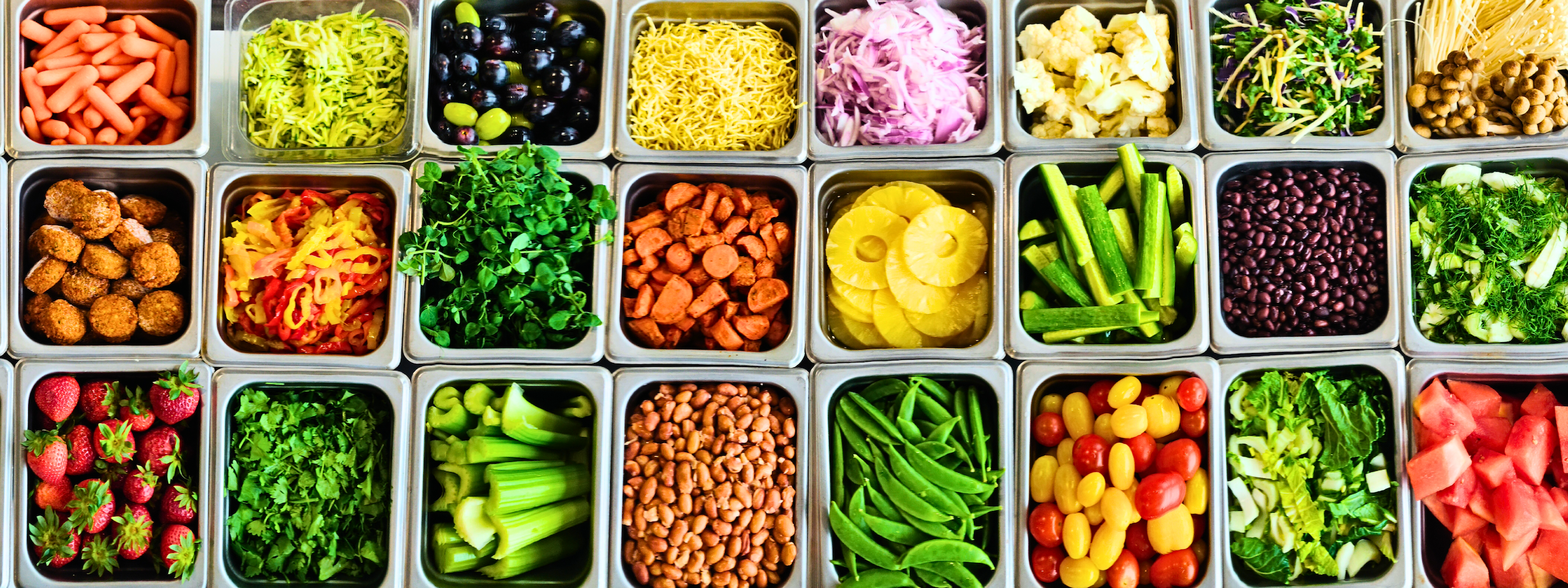 Fresh Bar is the heart of your lunch hour — refrigerated units, reusable plastic, and stainless steel inserts filled with delicious ingredients.